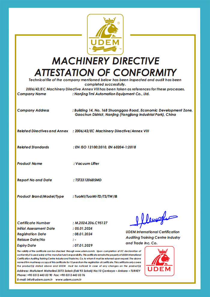 南京拓弥自动化设备有限公司总部位于南京市高淳经济开发区荆花路2号,公司拥有20余年的真空技术研发经验,致力于研发符合人体工程学原理的省力搬运解决方案;是一家集研发、设计、生产、制造、安装、维修、销售为一体的国家级高新技术企业,本公司产品已通过欧盟CE认证、本公司已通过IS09001质量管理体系、IS045001职业健康安全管理体系认证。
