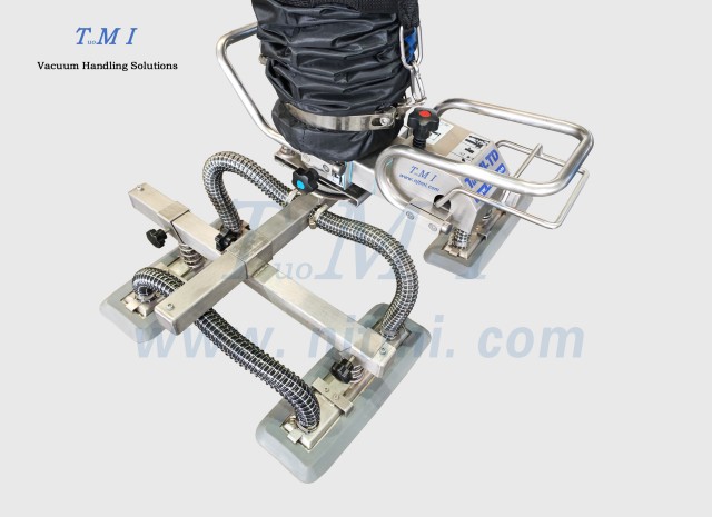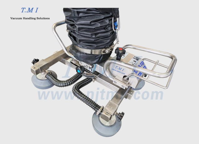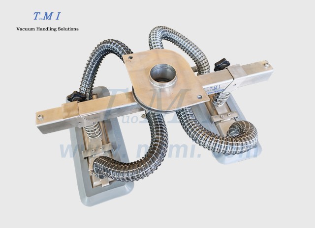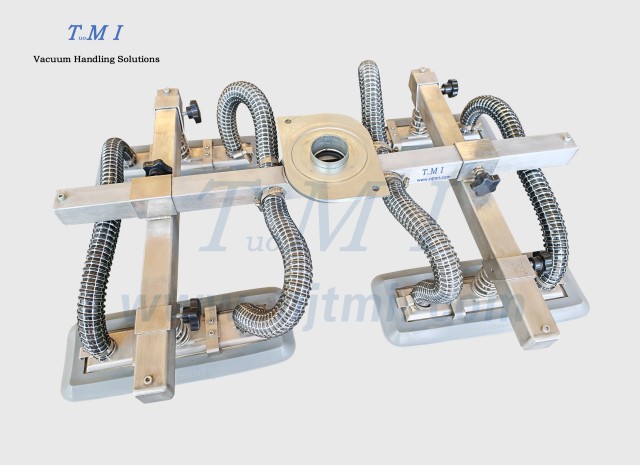 标准TD手柄+圆形波纹橡胶四吸盘主要应用于较大的纸箱、机柜、板材等工件的搬运、码垛,吸盘的距离可在横梁上自行调节、横梁可在主梁上自行调节 -