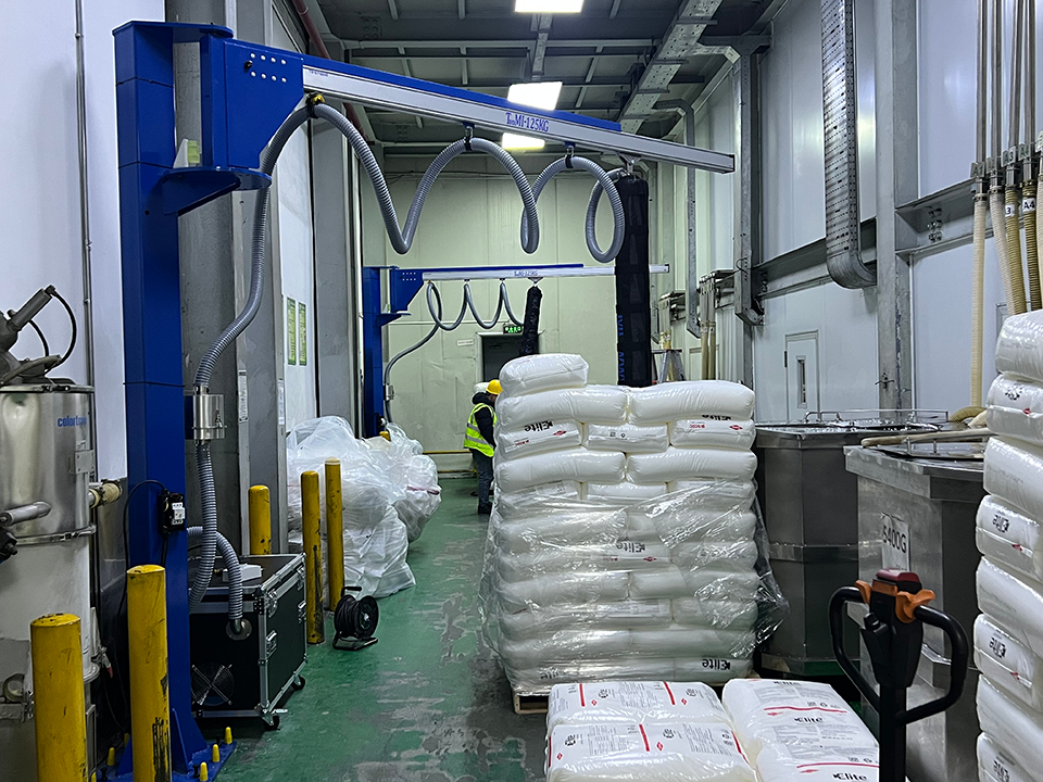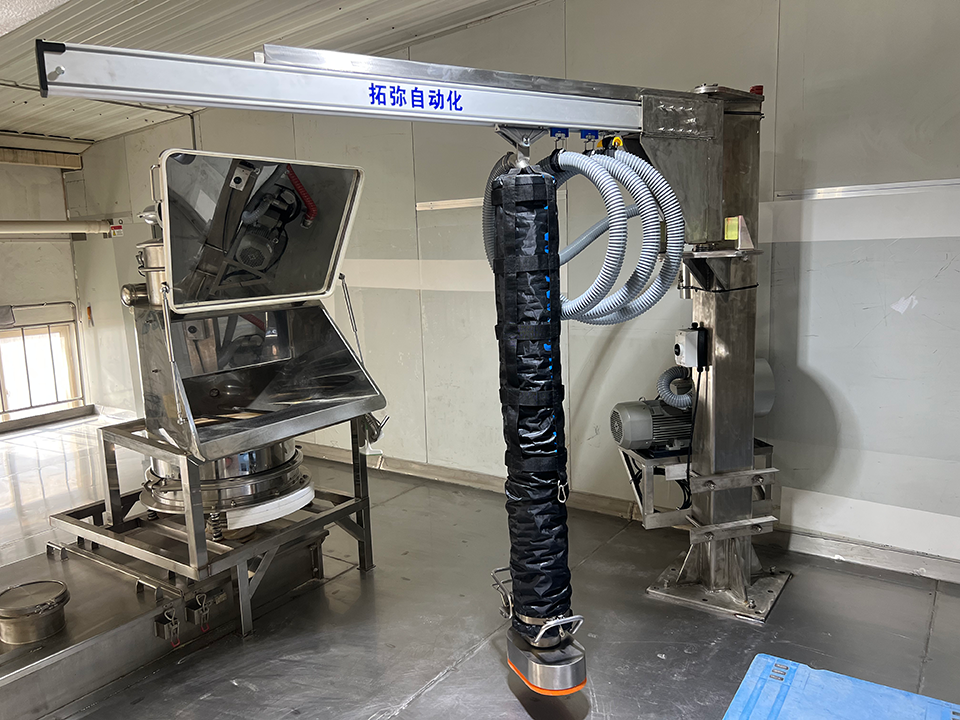 真空管吸吊机TD/TS系列-编织袋的应用:(真空管吸吊机利用强大的真空吸附原理,通过吸盘吸取袋子,实现从搬运、码垛到拆垛的全流程,且可以无损伤工件。尤其适合食品饮料、化工等行业对卫生、防爆、防酸有要求的场景)